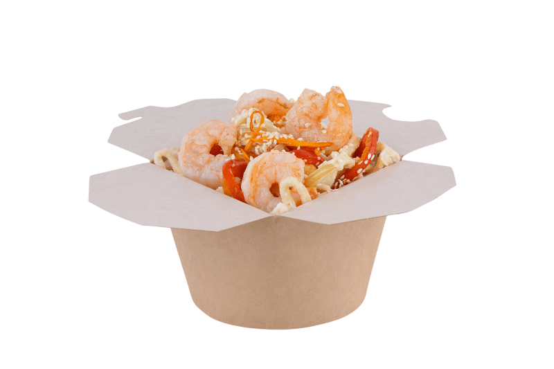 Королевская креветка, фасоль стручковая, морковь, лук репчатый, перец болгарский, сливочный соус, масло подсолнечное, соевый соус, кунжут. Гарнир на выбор(лапша/рис)
