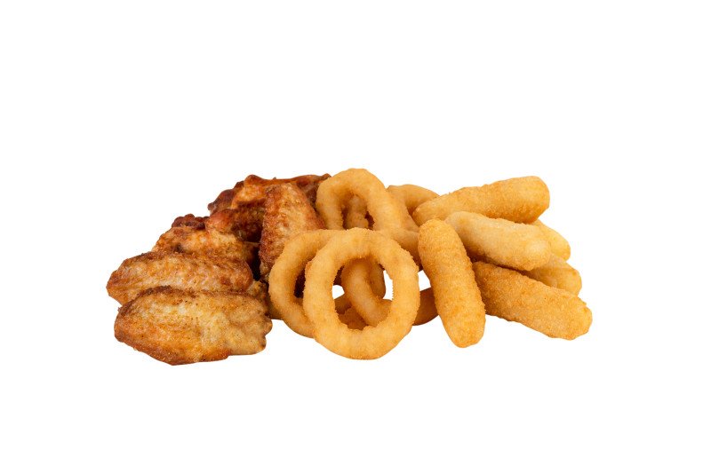 Люкс бокс350 гКреветки в хрустящей панировке 6 шт, Луковые кольца 8 шт, Сырные палочки 6 шт, масло подсолнечное.